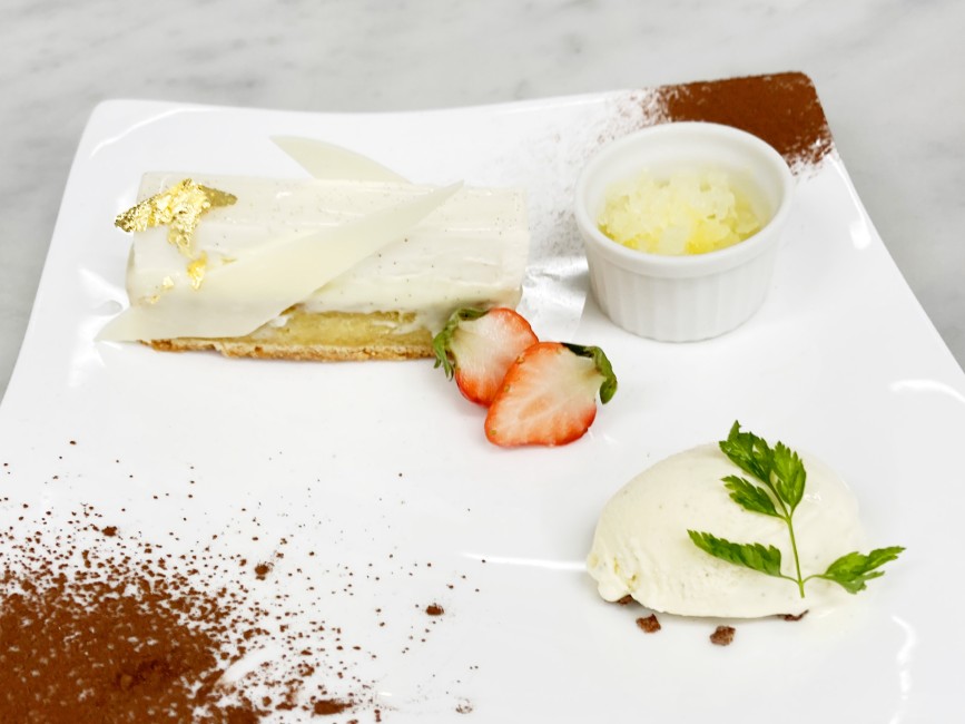 バニラムース・バニラタルト・バニラアイスに、ゆずのグラニテを合わせました。