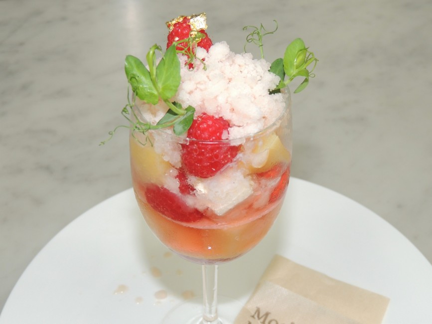 一番上には桃シャーベットを乗せた、桃をたっぷり楽しめるスイーツです。