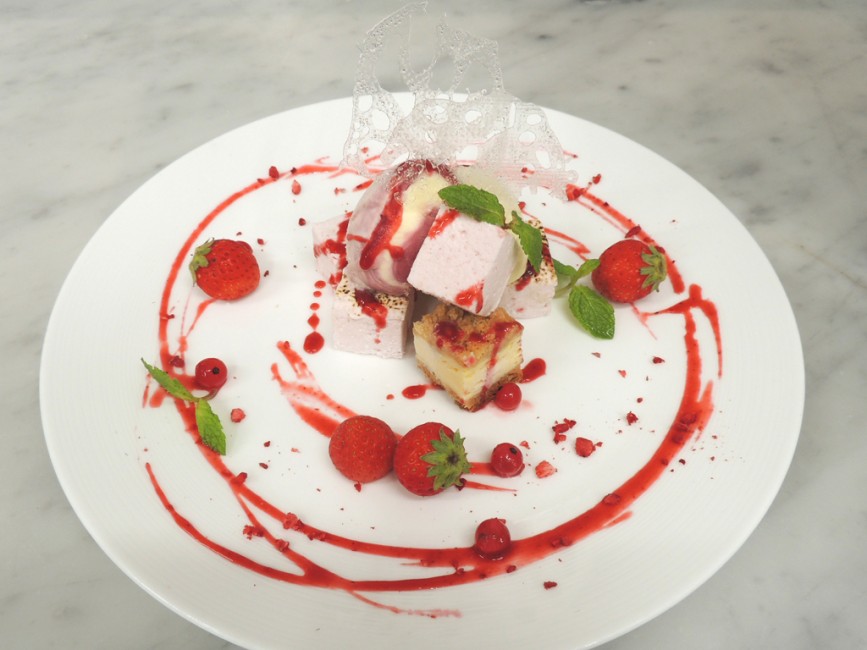チーズケーキと、マシュマロのようにむぎゅっとした食感の苺のギモーヴを合わせた一皿です。